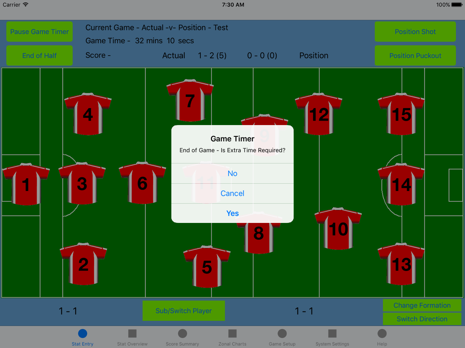When the user selects the end of half button while in the second half they will no be prompted to select if there is Extra time to be played as in the figure below.