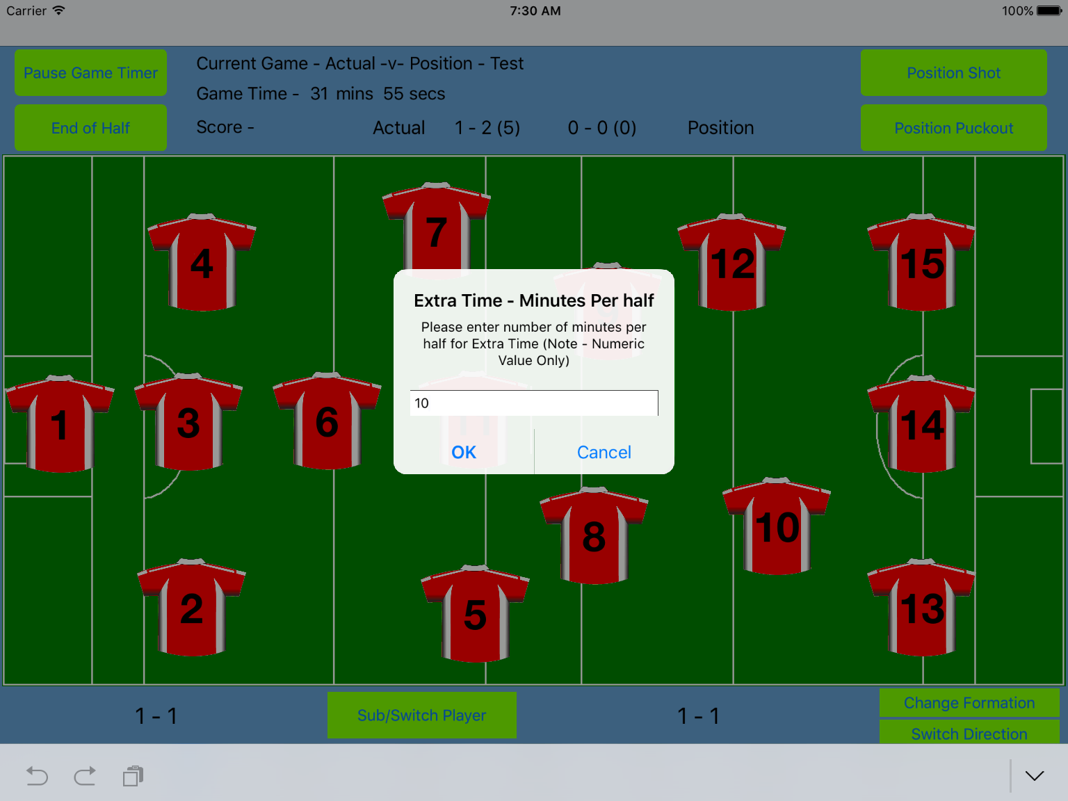Selecting No will end the game as normal and selecting cancel will cancel the game end and return the user to the active game. If Yes is selected denoting that Extra time is to be played another pop up as seen in the Figure below is shown where the user is prompted to enter the minutes per half to be played in this game.