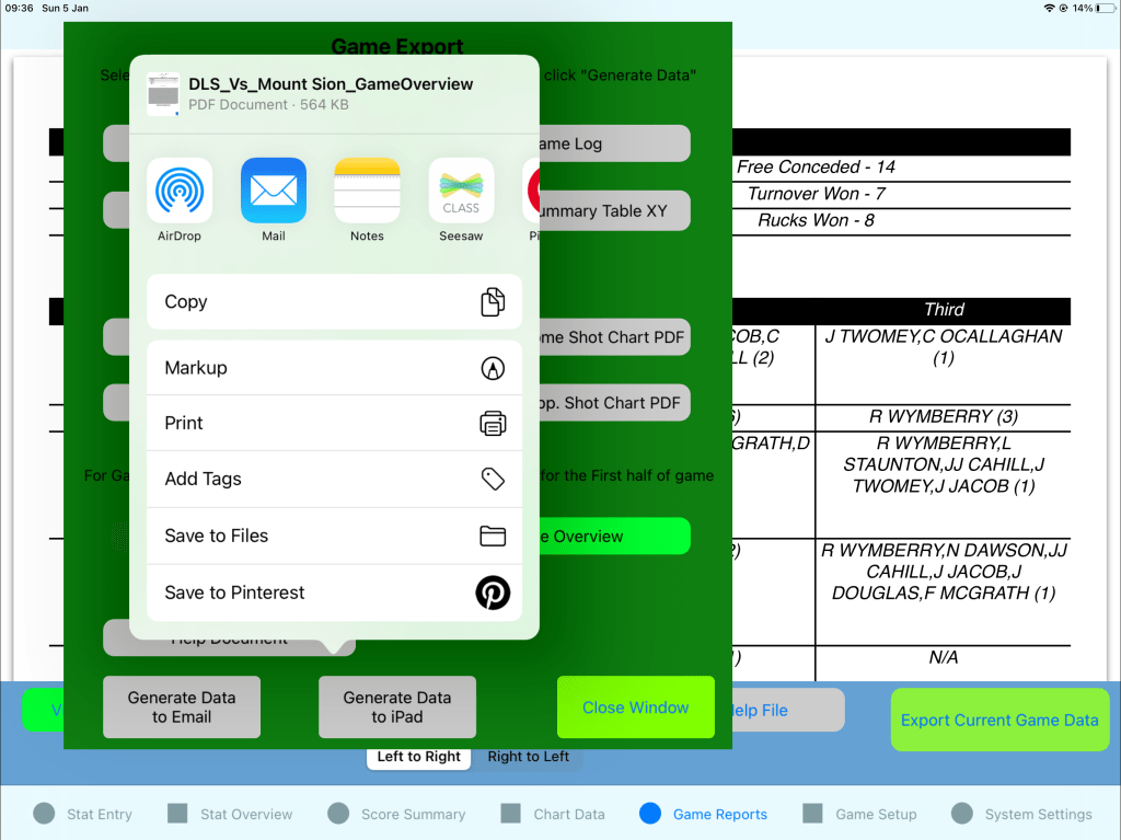 From the Game Export screen select reports to be generated and select the Generate Data to iPad button. From here various options based on Apps installed will be offered. In addition the Save to Files option is found from the context menu.