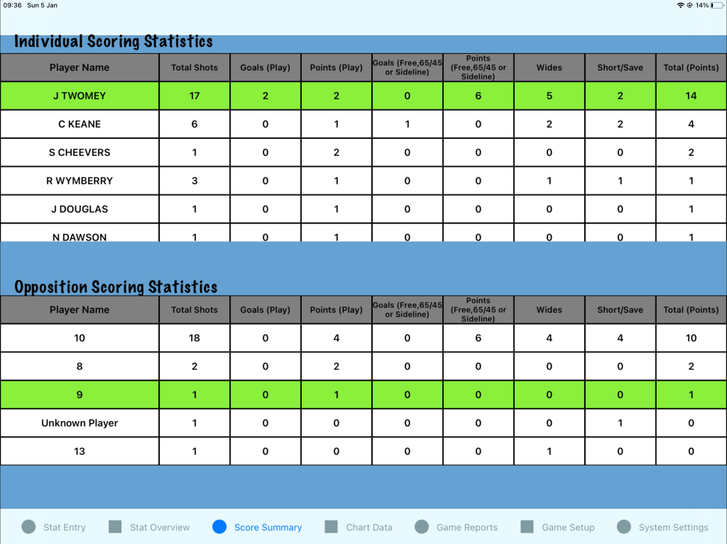 The Score Summary tab now also includes a breakdown of score by player for Opposition in addition to the home team. This allows you to see at a glance the Opponents shot efficiency by player. This view has also been added to the Game Summary PDF.