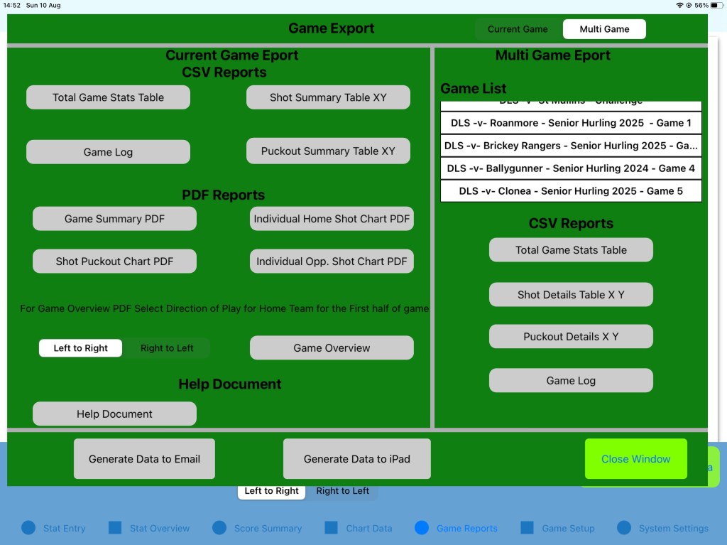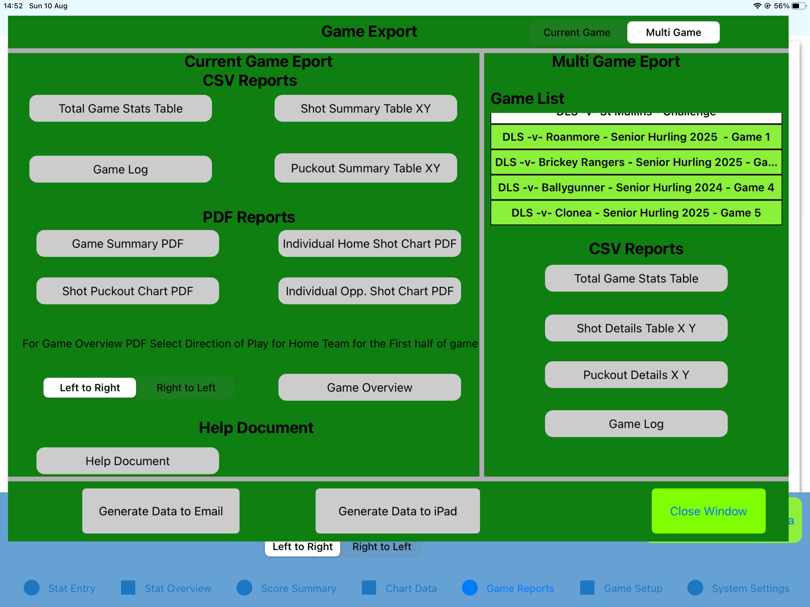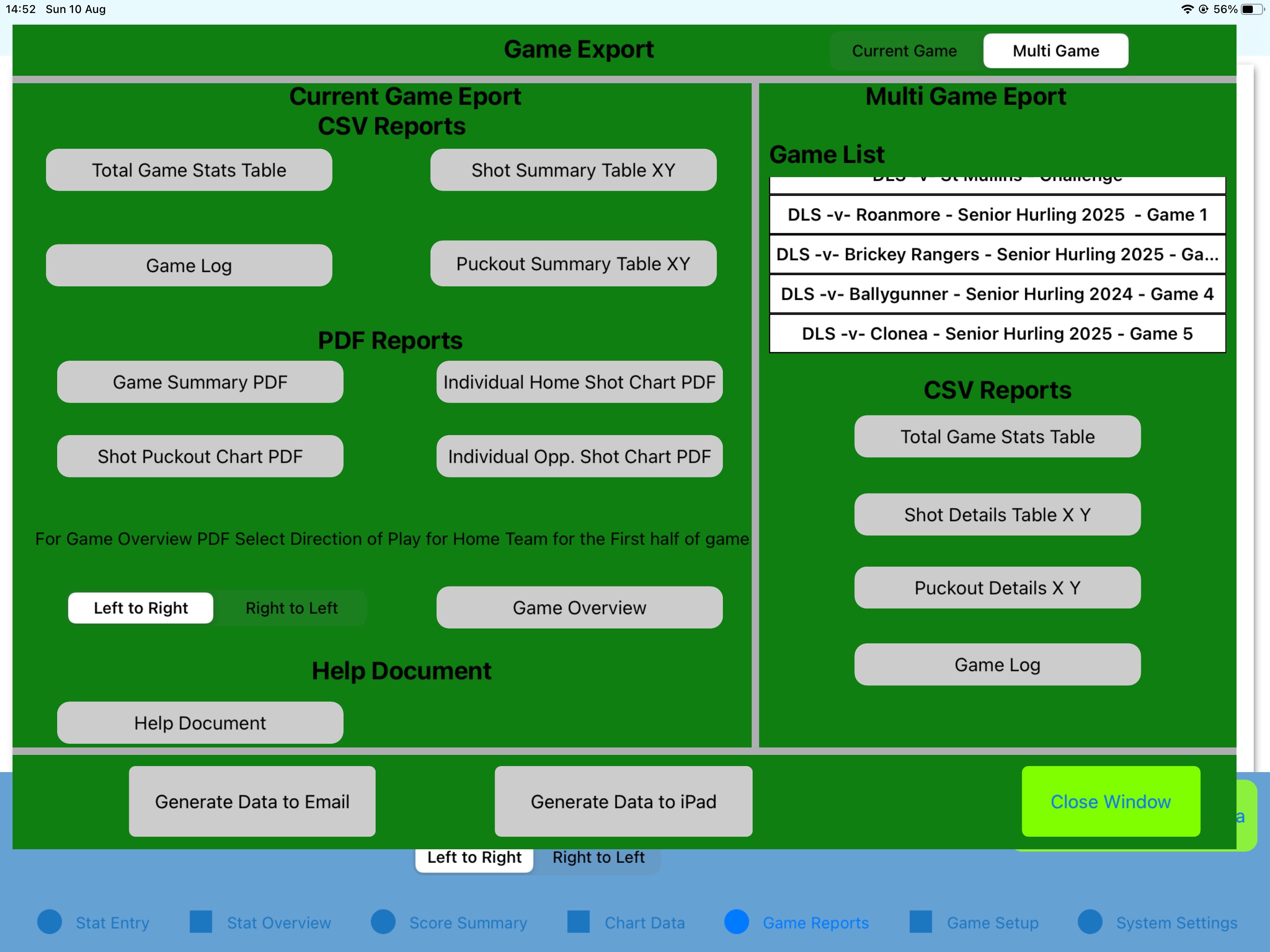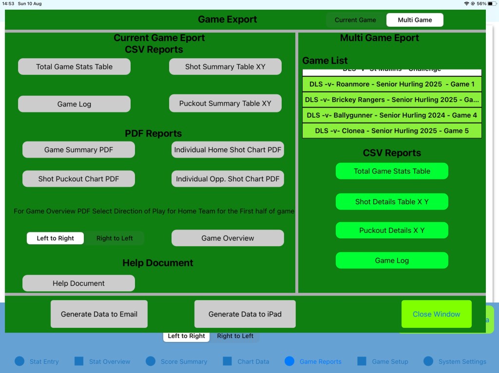 This new addition allows you to export multiple games in same CSV file. This addition allows you to export the Shots, Puckouts, Total Individual Stats and Game Log.